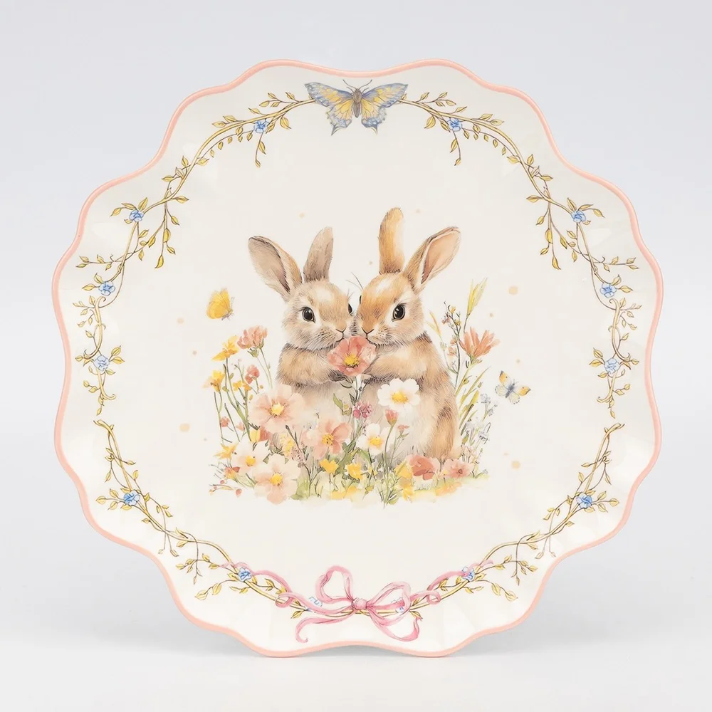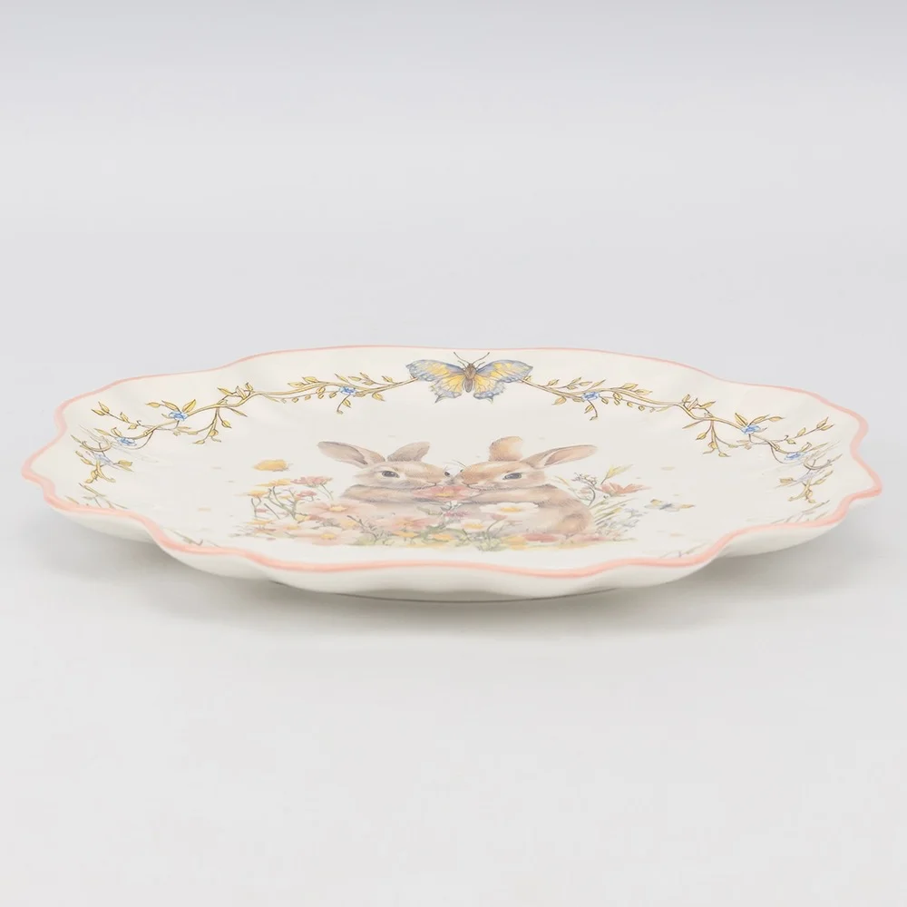 Тарілка "Пара кроликів у квітковому полі", біла, 26 см, кераміка